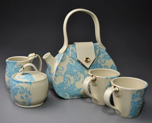 Tea-Bags are fully functioning teapots. They are slab built porcelain, hand sculpted and glazed. The details of stitching and seam lines are all refined after the piece has been constructed, but before firing. After being bisque and glaze fired, these pieces are fired a third time to add a gold luster glaze. The gold luster adds a final finish to the buckles and zippers. They are all one of a kind, no molds are used. All designs are available in matching sugar and creamer sets, and tea cups. Teapot collectors are drawn to them, no collection is complete without one.